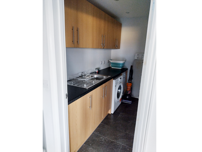 With electric cooker, microwave, fridge/freezer, dishwasher and tiled floor.