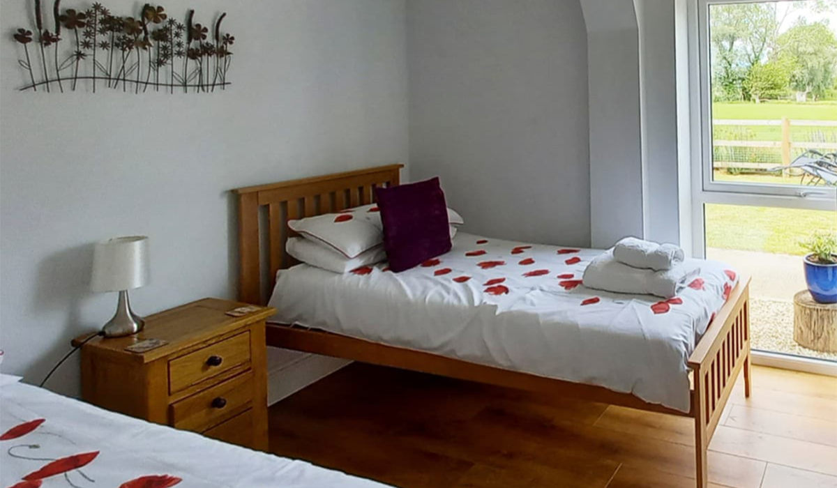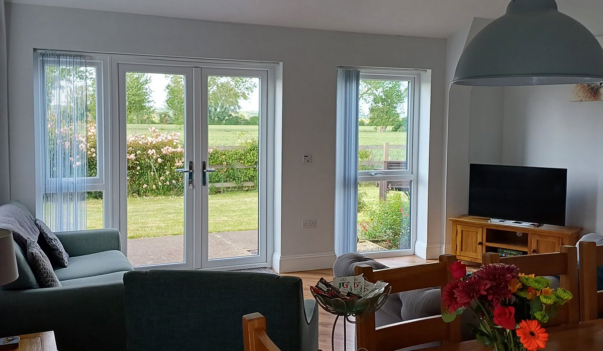 With double sofa bed (for flexible sleeping arrangements), 43″ Freeview TV, DVD player and patio doors leading to garden.